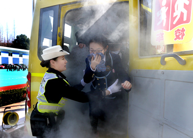 2月27日,民警在指导上海世界外国语小学学生从“起火”的校车中紧急疏散。